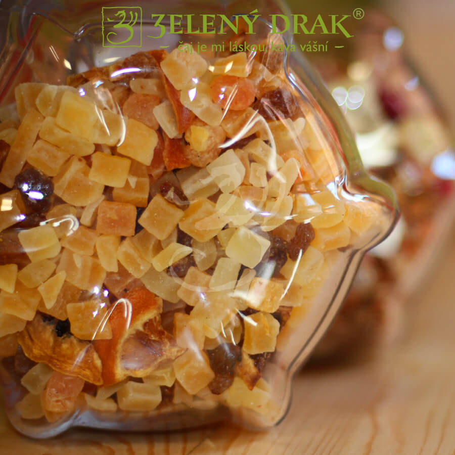 Složení čaje: mango (mango, cukr) (64%), hroznové víno (hrozny, zeleninový olej), papája (papája, cukr), ananas (ananas, cukr), přírodní aroma, pomerančové kousky, kousky citronu.